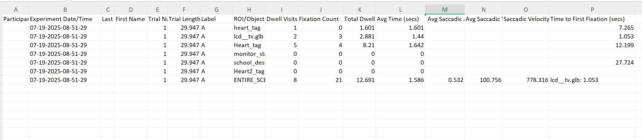 Experiment Summary - Shows a summary of the Dwell view count, fixation count, dwell time, average view time, per trial saccade calculations, time to first fixation, trial length, as well as any additional data that you want to summarize per trial. See documentation on how to add more data.