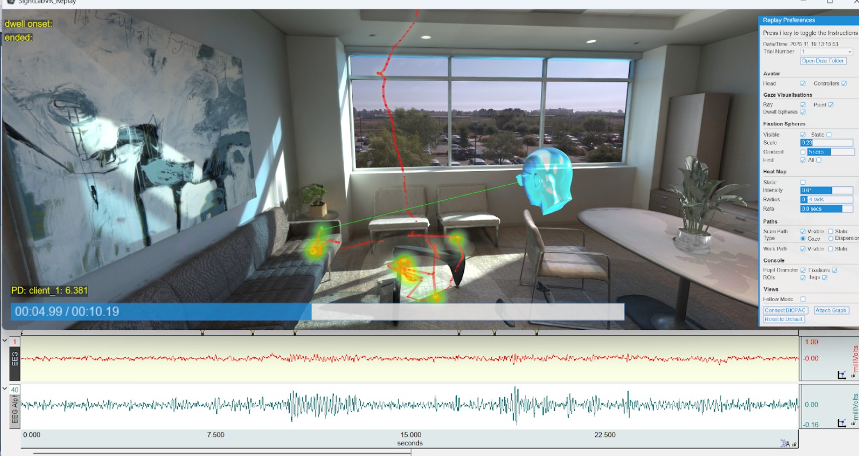 You can also adjust what is displayed using SightLab’s replay visualization tools—sliders, toggles, and visibility controls for gaze paths, fixations, dwell spheres, and more. This allows you to seamlessly inspect physiological signals and VR behavior data together, frame-aligned.