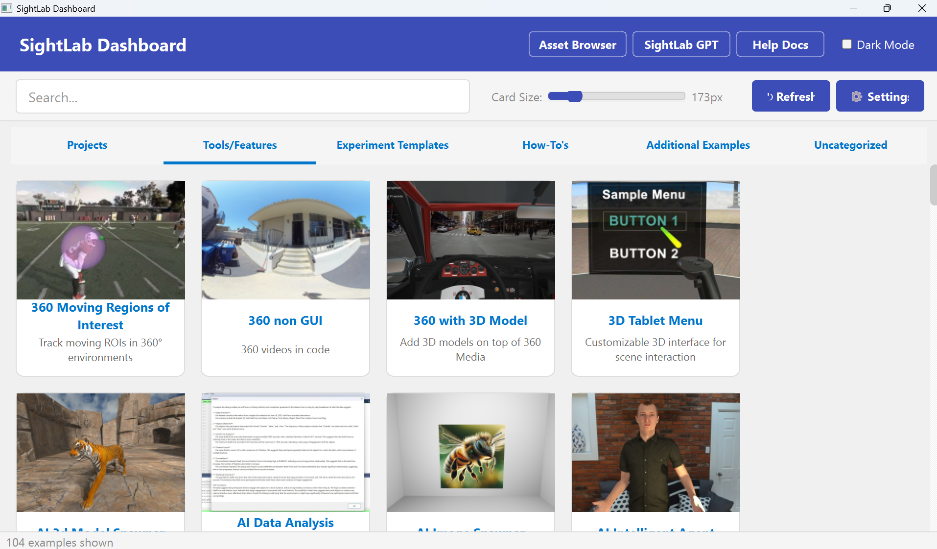 The new SightLab Dashboard gives you a single window to browse, search, launch, and manage all your SightLab content. Create new projects from templates, discover example scripts organized by category, mark favorites, and launch apps like Vizard and Inspector — all without navigating folders. Customize cards with thumbnails and descriptions, attach videos and documentation, manage multi-user scripts, and sort projects by name or date. Available as a standalone executable with light and dark theme support.