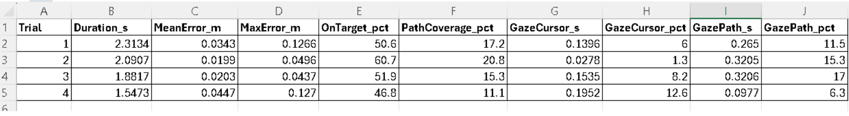 | On Target % | Percentage of frames during which the cursor was within TARGET_DISTANCE of the path. | Equivalent to Percentage of Task Time within Target Region (PTTR). Higher is better. |