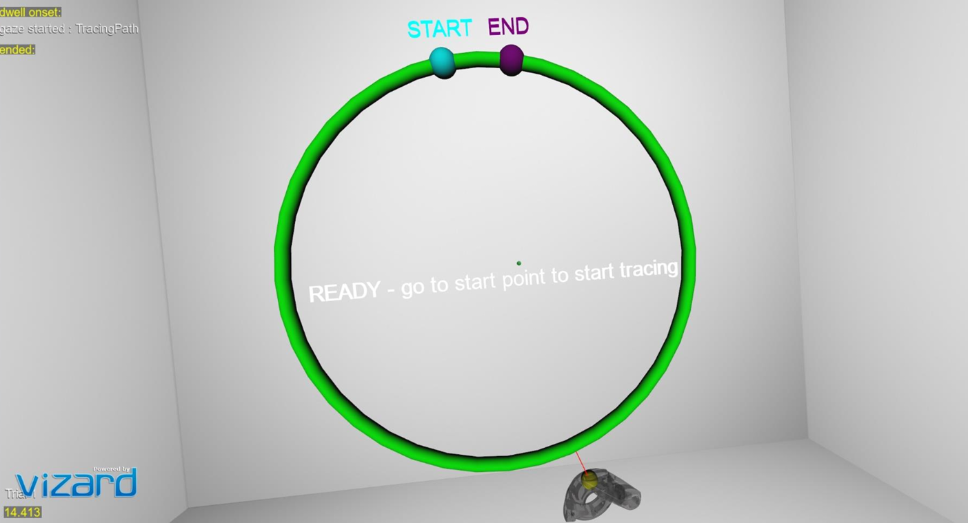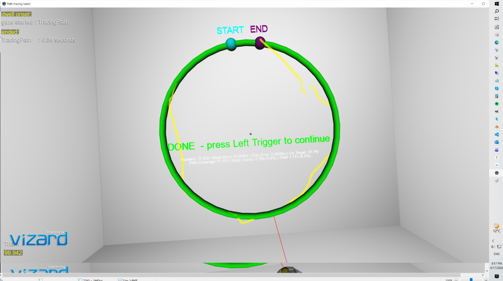The paradigm asks a participant to use the right-hand controller to trace a circular path displayed in 3D space in front of them. The system continuously measures how accurately they follow the path, records gaze behavior via the integrated eye tracker, streams data to external recording software via Lab Streaming Layer (LSL), and plays real-time audio feedback indicating whether the participant is on or off target.